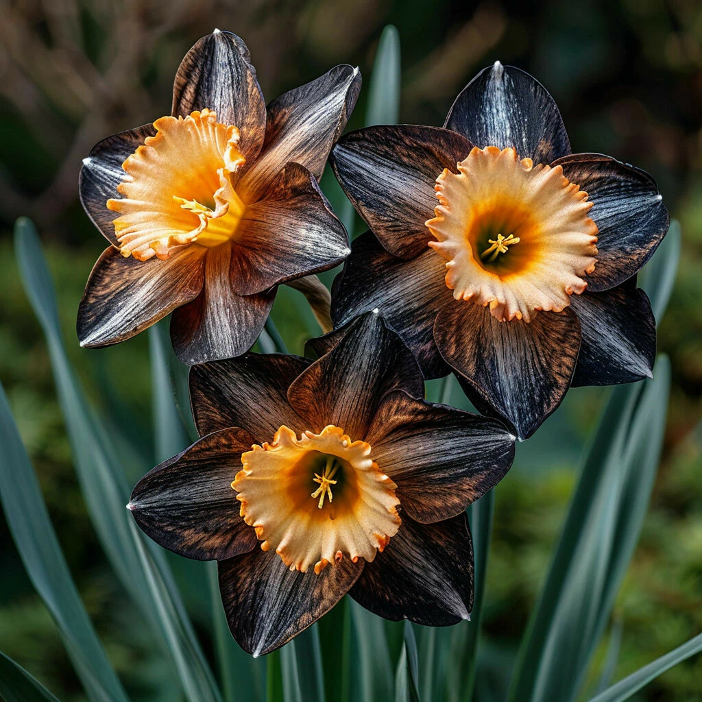 - Неповторимая окраска: главная особенность этого сорта — его уникальная и контрастная окраска. Лепестки нарцисса Сприн Видс имеют насыщенный черный цвет, что является большой редкостью для нарциссов и придает им мистический шарм. Середина цветка украшена яркой, солнечной желтой коронкой, создавая эффектный контраст и делая этот нарцисс особенно привлекательным.